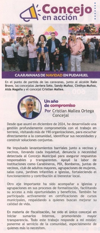 Renovación Nacional Pudahuel nace del esfuerzo de vecinos y familias que creen en una política al servicio de la comunidad. Con un compromiso arraigado en cada barrio, hemos estado presentes, promoviendo la unidad y el desarrollo de una comuna más justa y segura. A través de años de dedicación, logramos la representación en el Concejo Municipal con Cristian Mallea, quien continúa un enfoque de gestión centrado en el diálogo con los vecinos y la transparencia en el uso de recursos. Hoy seguimos creciendo con la convicción de que una mejor política se construye con trabajo y vocación de servicio.